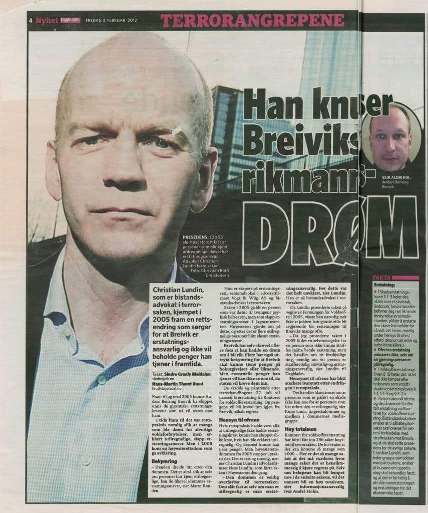 Christian Lundin, som er bistandsadvokat i terrorsaken, kjempet i 2005 fram en rettsendring som sørger for at Breivik er erstatningsansvarlig og ikke vil beholde penger han tjener i framtida.
