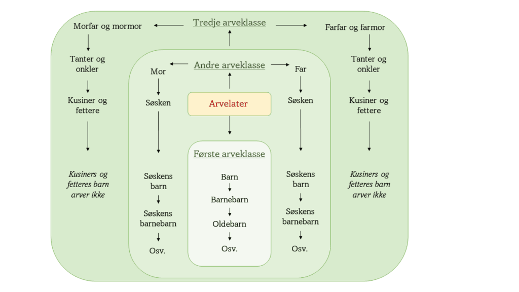 Arvetavlen viser hvordan arven fordeles mellom slektninger i tre arvegangsklasser. Den nærmeste klassen arver først, og arven går kun videre til neste klasse hvis det ikke finnes arvinger i den foregående klassen.